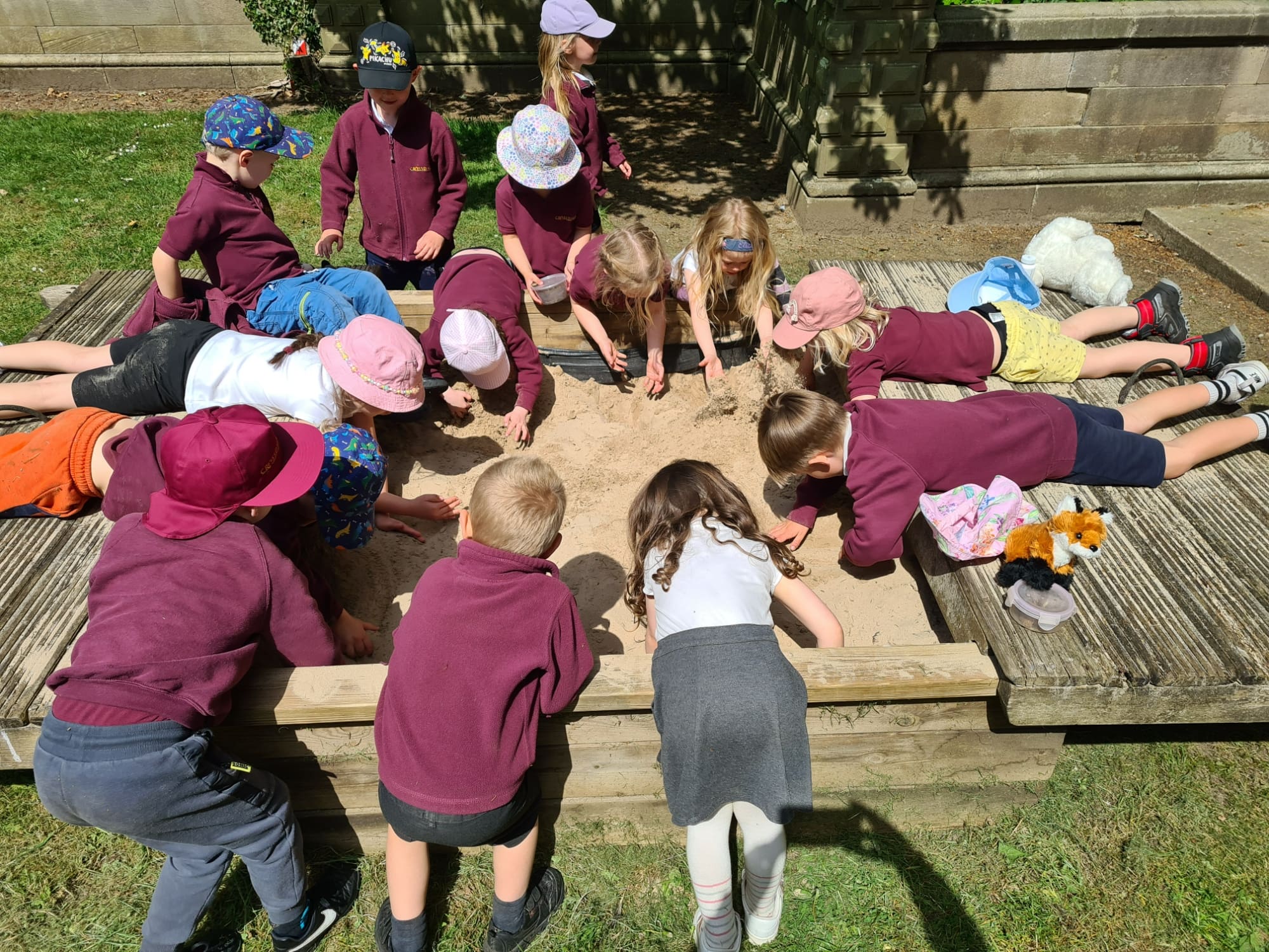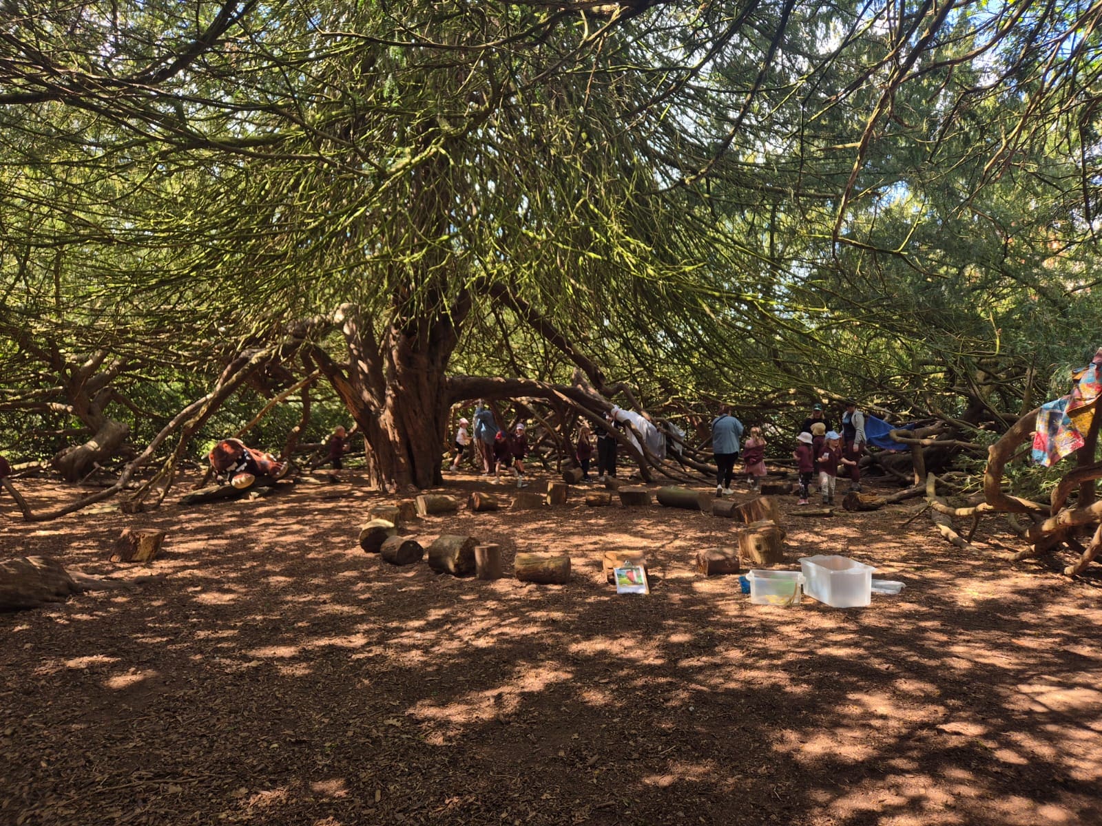 After lunch, we headed to the amazing Yew tree. It was a beautiful shady area with lots of hanging branches, perfect for den building. With help from our super parent helpers, the children made their dens, used torches, and made Gruffalo shakers to scare the Gruffalo away, just in case he appeared! We then found a letter from the park keeper, asking for help to find the animals and to have a Gruffalo tea party. The animals were hidden all over the garden which the children loved finding them. Some of the children wrote a letter back to the park keeper too telling him they had found them and had a lovely party. The children also made different animal prints in the giant sandpit.