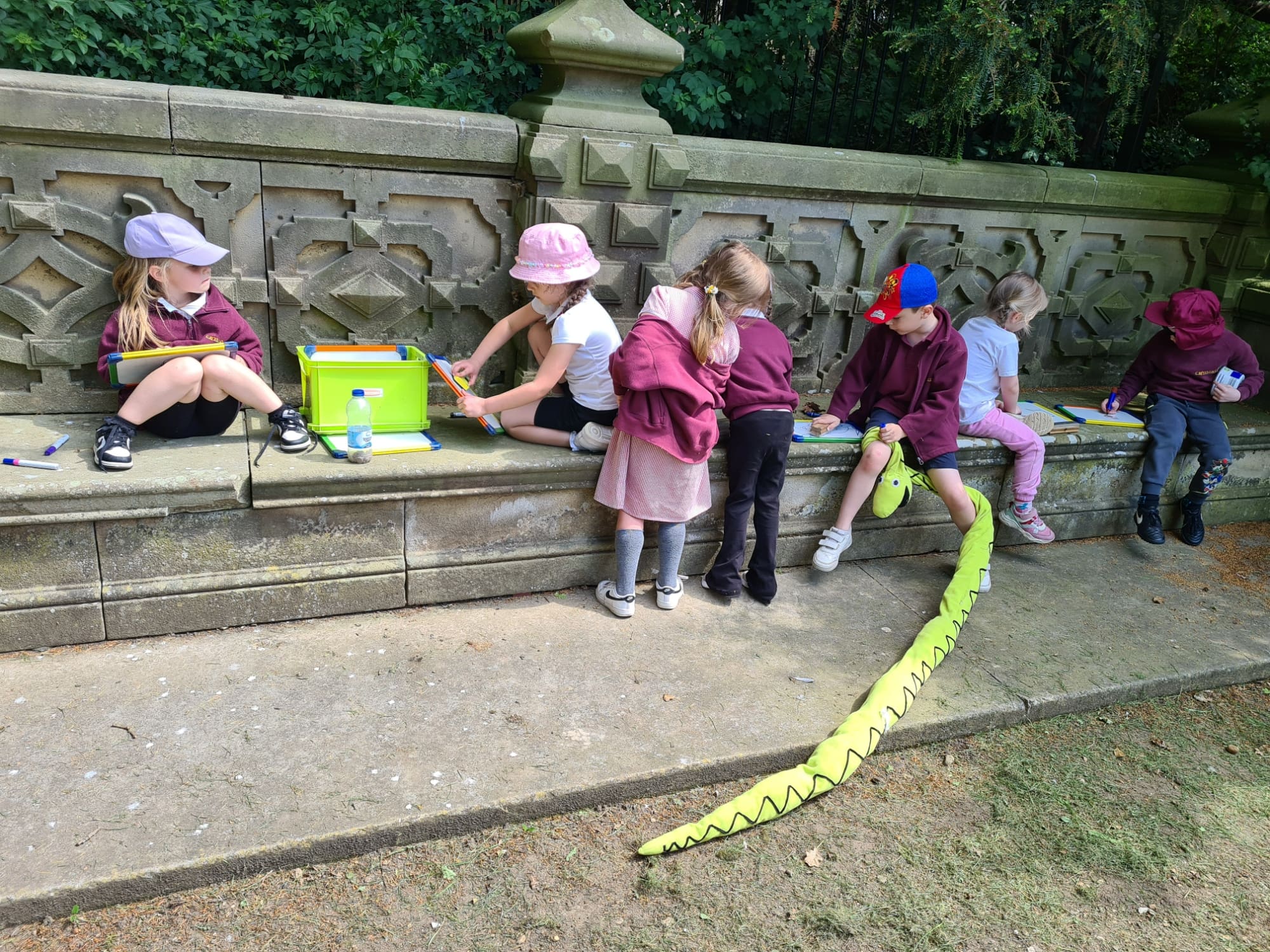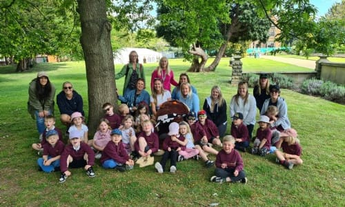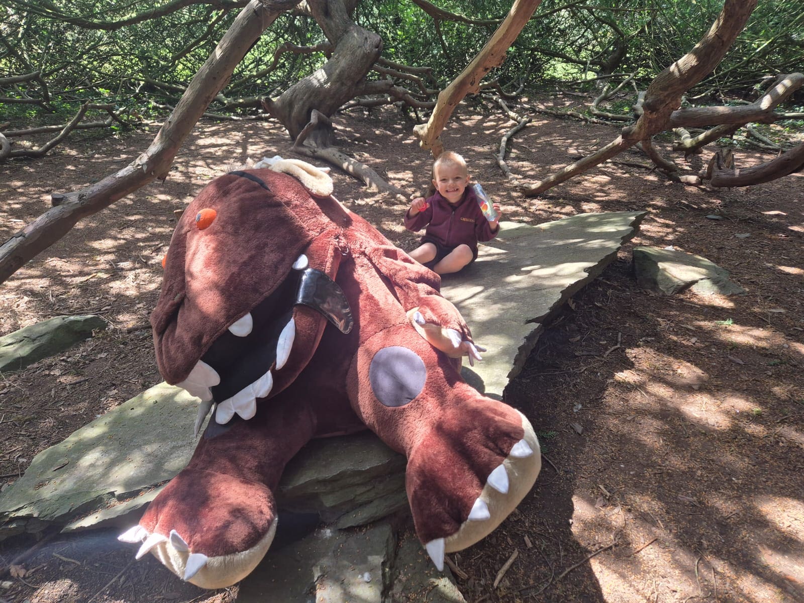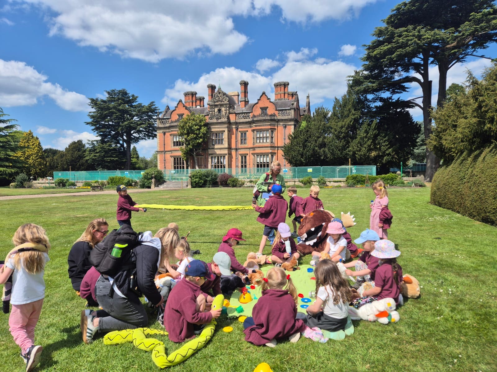 First, the children explored the Gruffalo wood keeping our eyes out for all the characters and finding their prints along the way. We also hunted for minibeast, and some made a minibeast hotel. As we came to the end of the wood, the children were so excited to find the Gruffalo hiding in his cave! Bravely, we all looked inside but left him peacefully relaxing in his cave. After a mid-morning drink and a snack, the Robins had fun on the Gruffalo park. After all that exercise, we were ready for lunch on the Beaumanor Hall lawn. What a lovely backdrop!