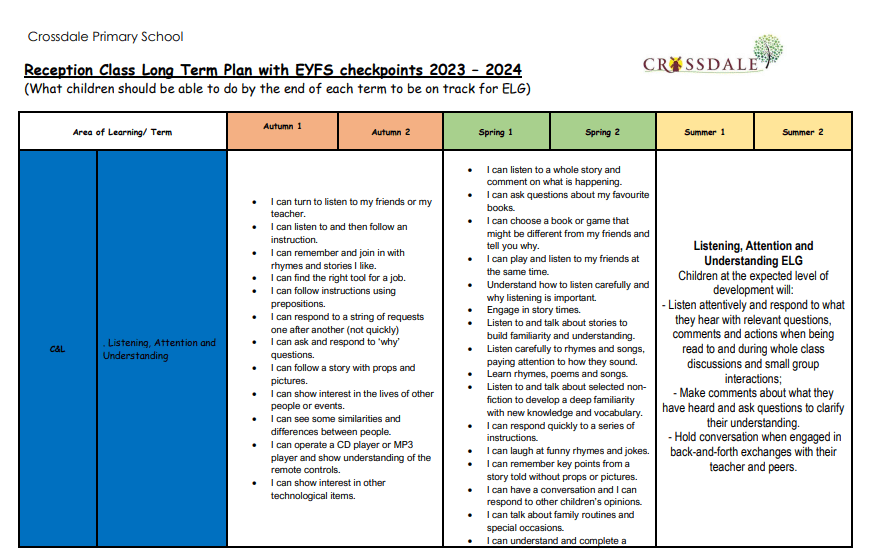 We have also included the document ‘Life in EYFS at Crossdale’ which captures some of the experiences and learning children will have throughout their first year of school with us.
