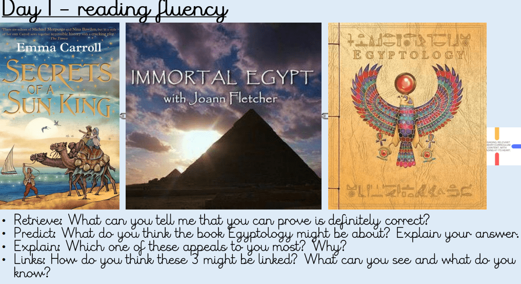 In KS2, high quality texts are used for whole class reading comprehension sessions, taught three times weekly using reading fluency strategies.
