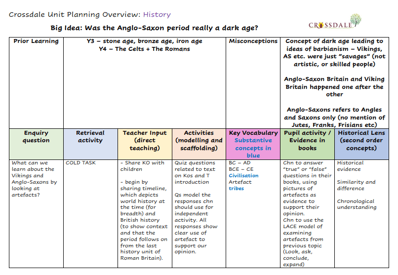 At Crossdale, we believe that a high-quality history education will help pupils gain a coherent knowledge and understanding of Britain’s past and that of the wider world. We aim to inspire children to become time detectives, developing their curiosity to know more about the past and develop their understanding of chronology through an enquiry based approach. History teaching focusses on enabling children to think as historians in a fun, exciting and cross-curricular way building on their skills and knowledge as they progress through the school. Visits and artefacts will be used to bring the past alive and encourage children to investigate and develop their skills of enquiry.